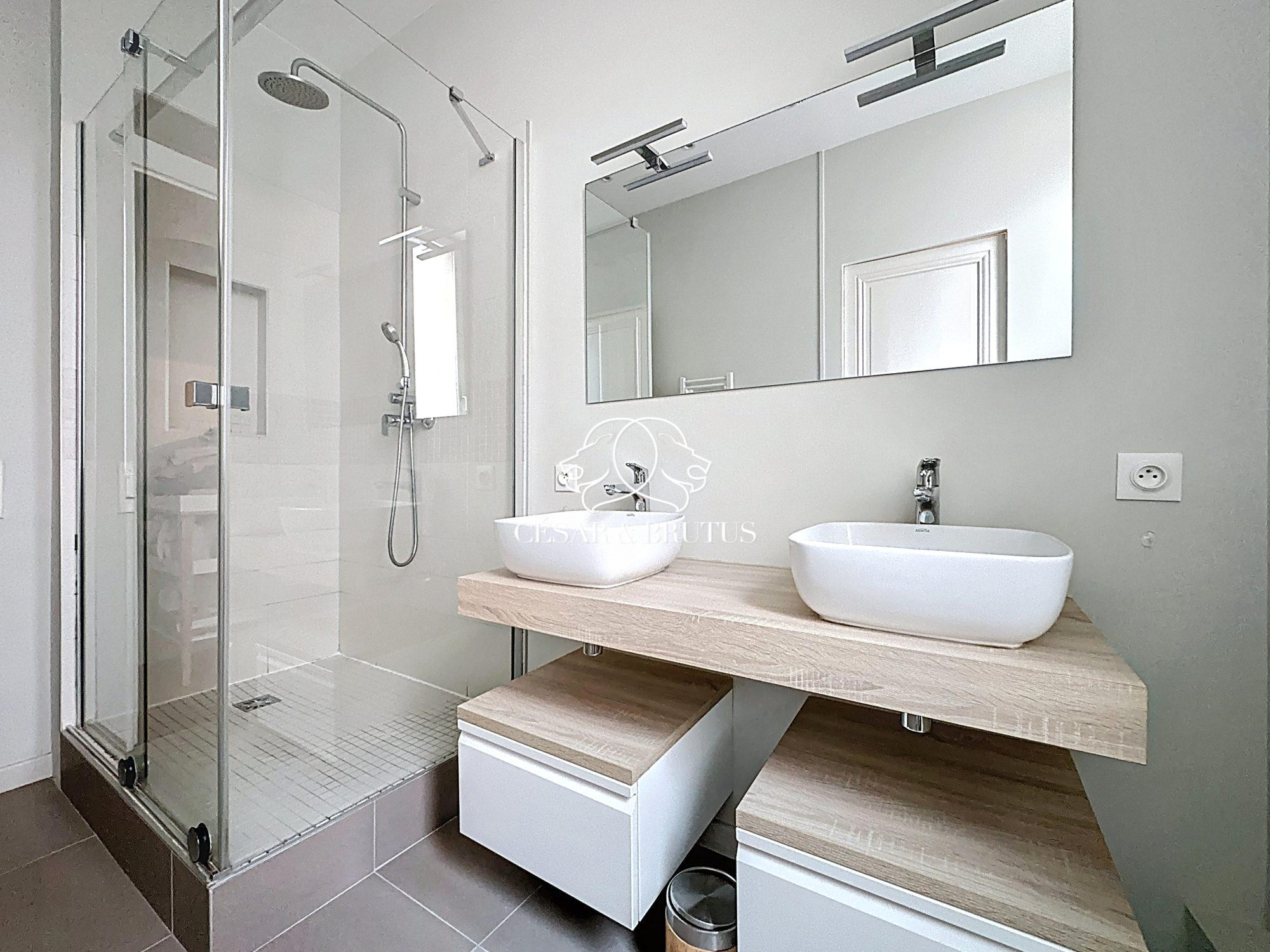 une spacieuse salle d’eau avec douche, double vasque et sèche serviette