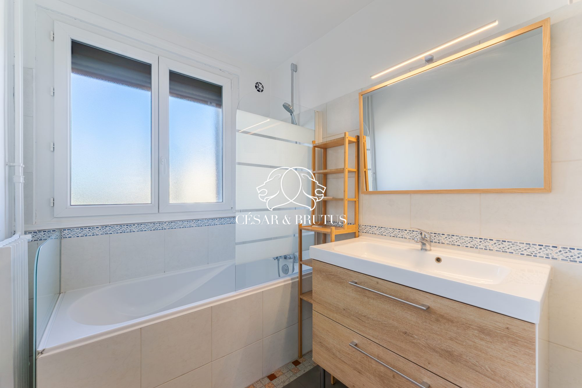 Il comprend également une chambre avec placard intégré, une salle de bain avec vasque, ainsi que des WC indépendants. L’ensemble du logement est équipé de double vitrage et de volets roulants électriques. La fibre est installée.