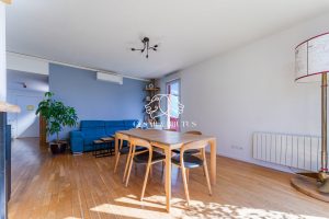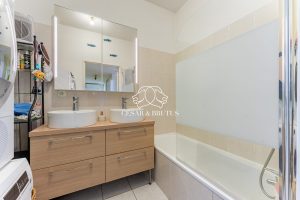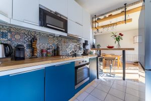 Entrée sécurisée avec porte blindée, séjour double très lumineux exposé ouest sans vis à vis, cuisine semi-ouverte entièrement équipée coté jour.