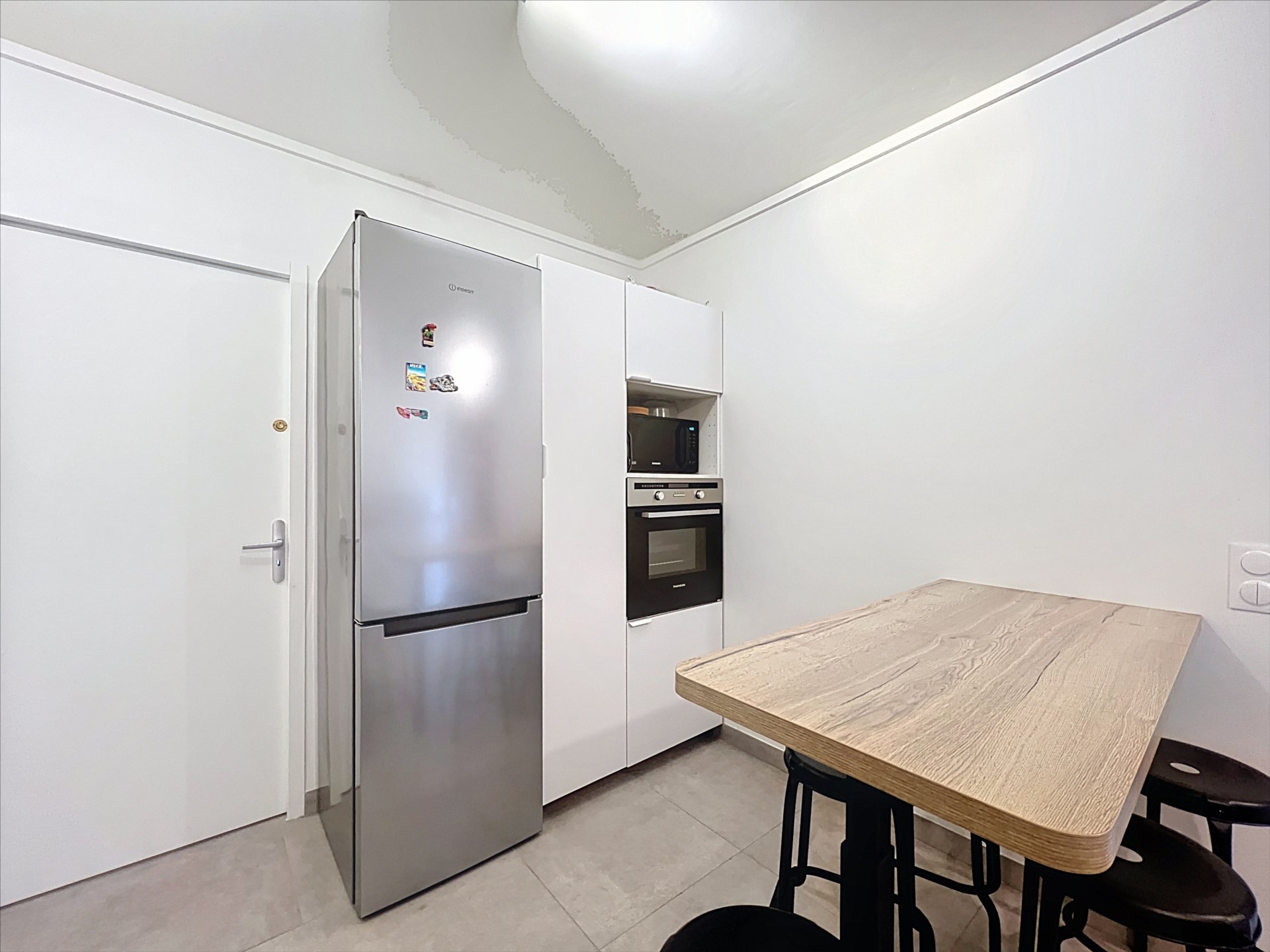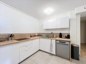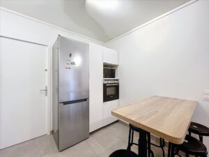 L'appartement se compose d'une pièce de vie ouverte sur une cuisine entièrement équipée (four plaques de cuisson, hotte, réfrigérateur, lave vaisselle), d'un cellier, d'un dégagement avec placard, de cinq chambres ainsi que d'une salle d'eau avec machine à laver et d'un wc