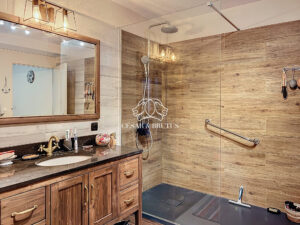 Espaces de vie : Une immense cuisine dînatoire de 30 m² et un salon chaleureux avec chauffage bois et électrique.