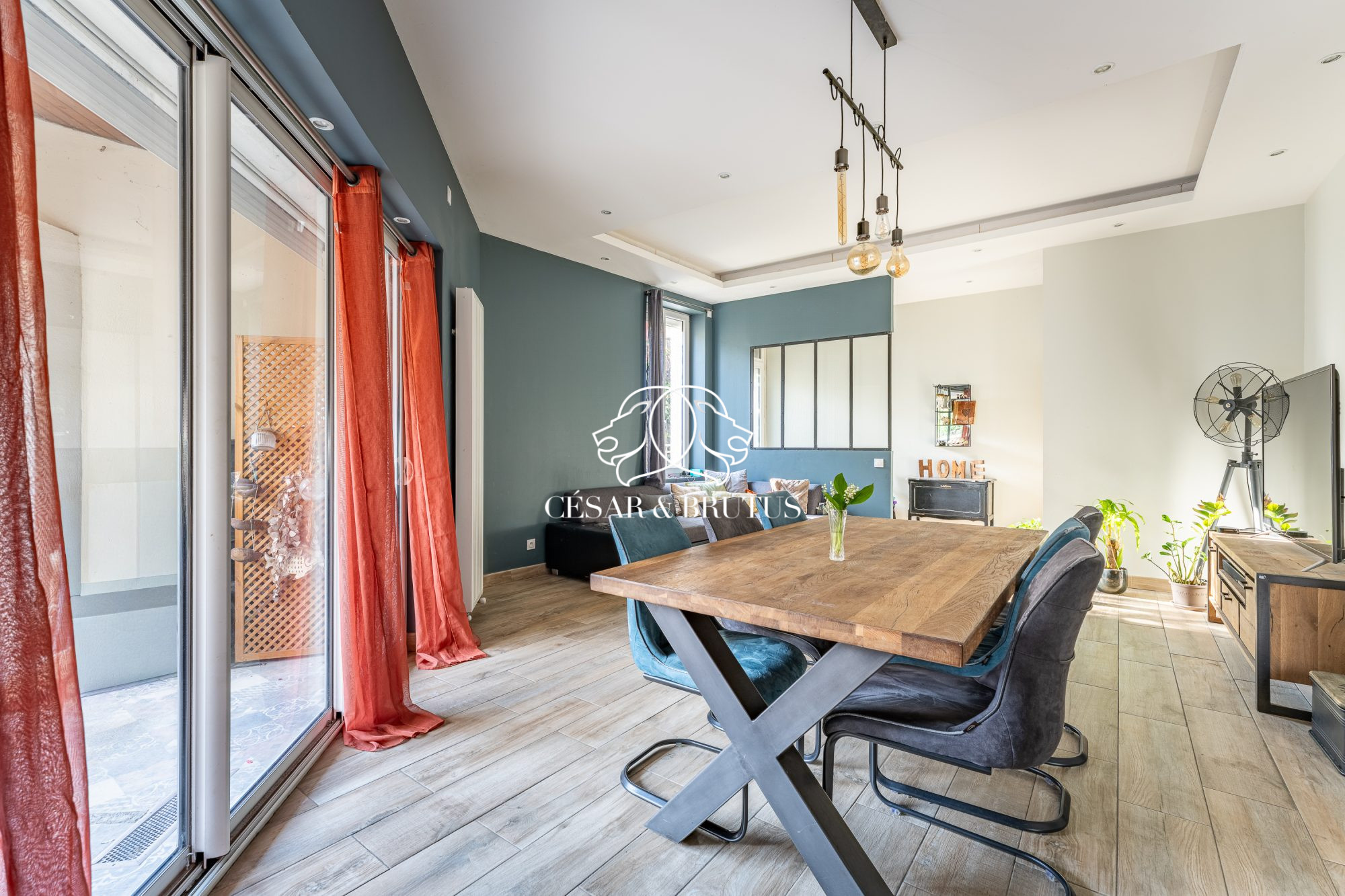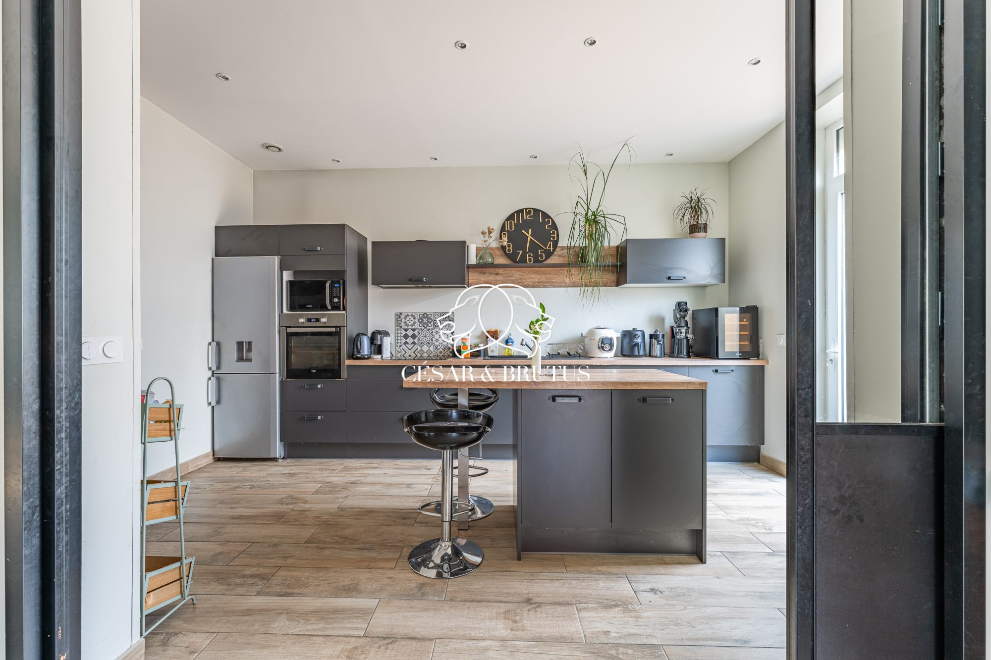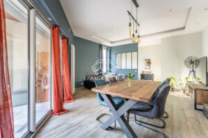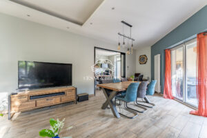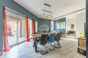 Au rez-de-chaussée, vous découvrirez une belle pièce de vie conviviale comprenant un salon chaleureux avec carrelage imitation parquet et une verrière de style atelier ouvrant sur la cuisine. Les larges ouvertures apportent une luminosité exceptionnelle et créent une belle continuité avec le jardin. Une chambre avec salle d’eau privative et accès direct à l’extérieur complète ce niveau, idéale pour un adolescent, une activité libérale ou un projet locatif.