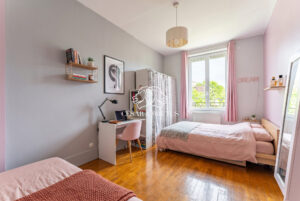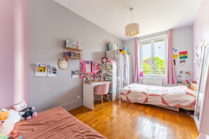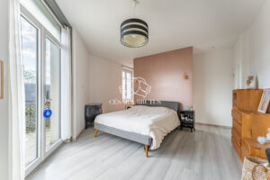À l’étage, l’espace nuit se compose de deux grandes chambres avec parquet d’origine, d’une salle de bain avec baignoire, ainsi que d’une suite parentale avec dressing, salle de bain, douche à l’italienne et WC. Un étage lumineux et parfaitement agencé.