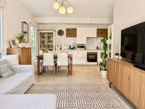 Espace de Vie Solaire : Une cuisine moderne ouverte sur un séjour. Cet ensemble est exposé Plein Sud, s'ouvrant directement sur le jardin.