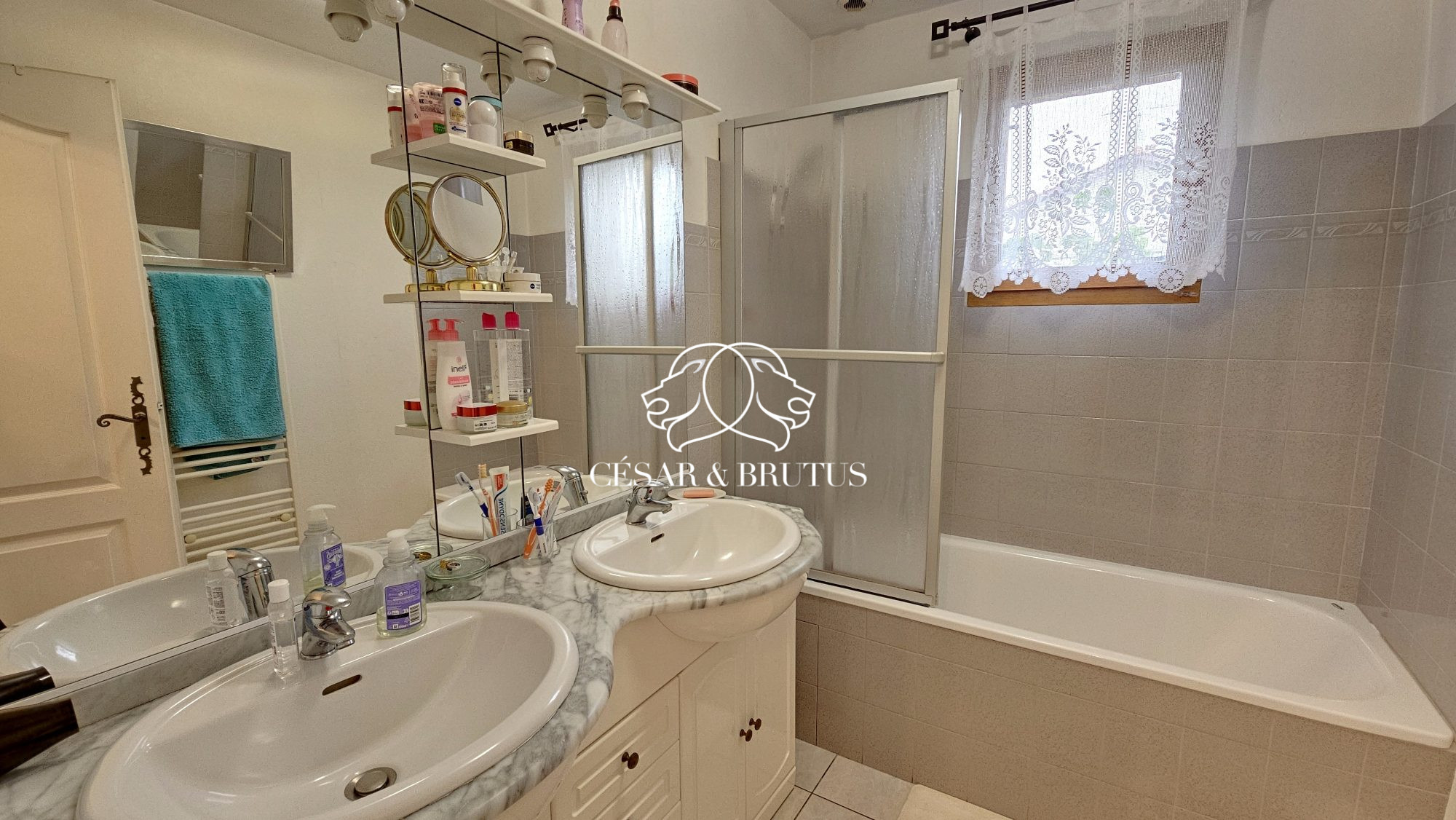 L’étage vous offre une première chambre orientée Nord et deux chambres au Sud sur les jardins intérieurs, une salle de bain avec baignoire, double vasque et sèche serviette ainsi qu’un second WC indépendant.