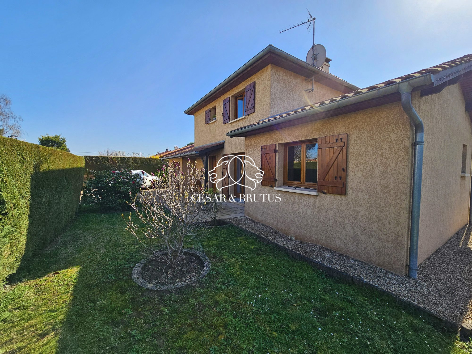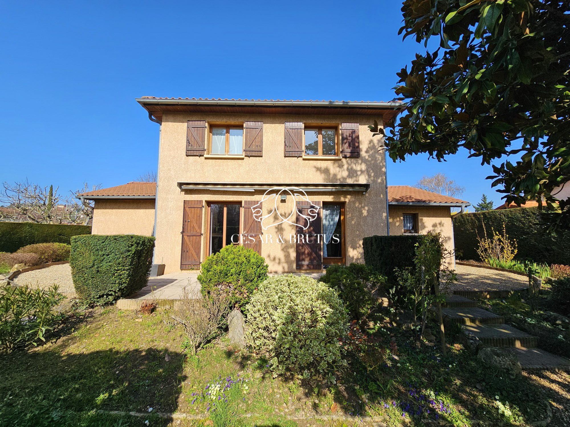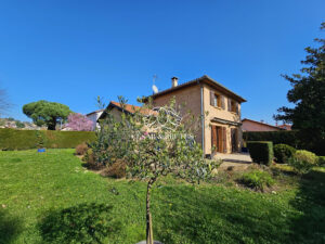 Lozanne centre, en proximité de toutes les commodités (Commerces, Ecoles, Transports), maison familiale T5 de 105,50 m² (103,24 m² habitables) sur 2 niveaux, nichée au calme, sur une parcelle plate entièrement close et parfaitement paysagée de 713 m² .