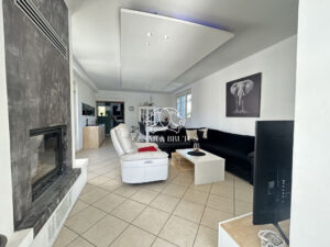 Dès l’arrivée, la maison séduit par son implantation, sa luminosité et son atmosphère paisible.L’espace de vie, traversant et baigné de lumière, accueille un salon / salle à manger convivial, ouvert sur le jardin et les terrasses, offrant une vraie continuité entre intérieur et extérieur. La cheminée à foyer fermé vient renforcer le confort et l’esprit chaleureux des lieux.
