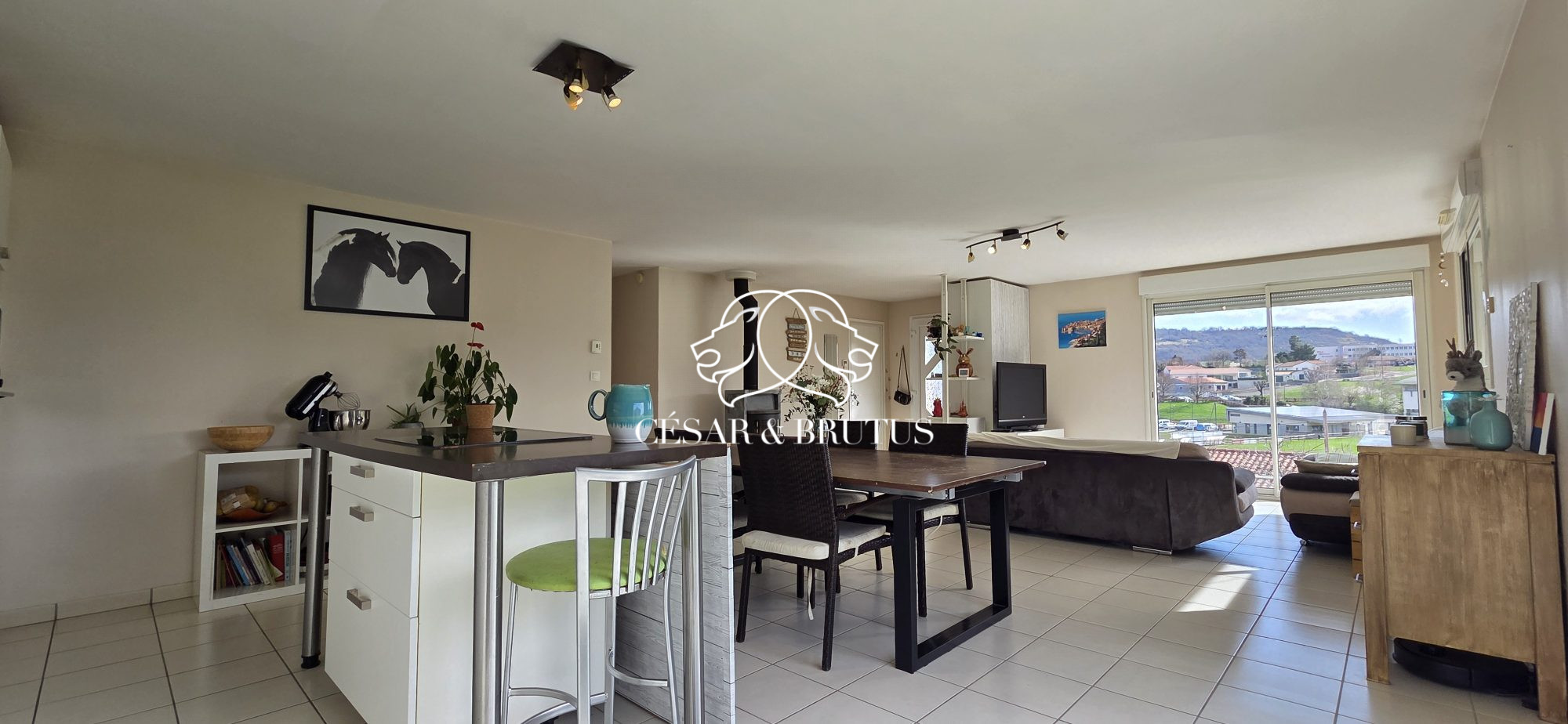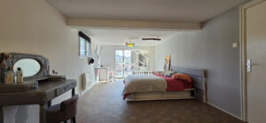 Accessible par quelques marches, une belle pièce de vie aux volumes généreux, baignée de lumière grâce à son exposition plein sud, créant une atmosphère chaleureuse et conviviale.