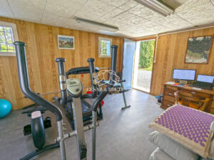 - Un troisième espace accessible par quelques marches, vous offre un dégagement avec différentes solutions de rangements, une buanderie, un second cabinet de toilettes et un grand espace de près de 20 m² aménagé aujourd’hui en salle de sport et bureaux avec entrée indépendante.