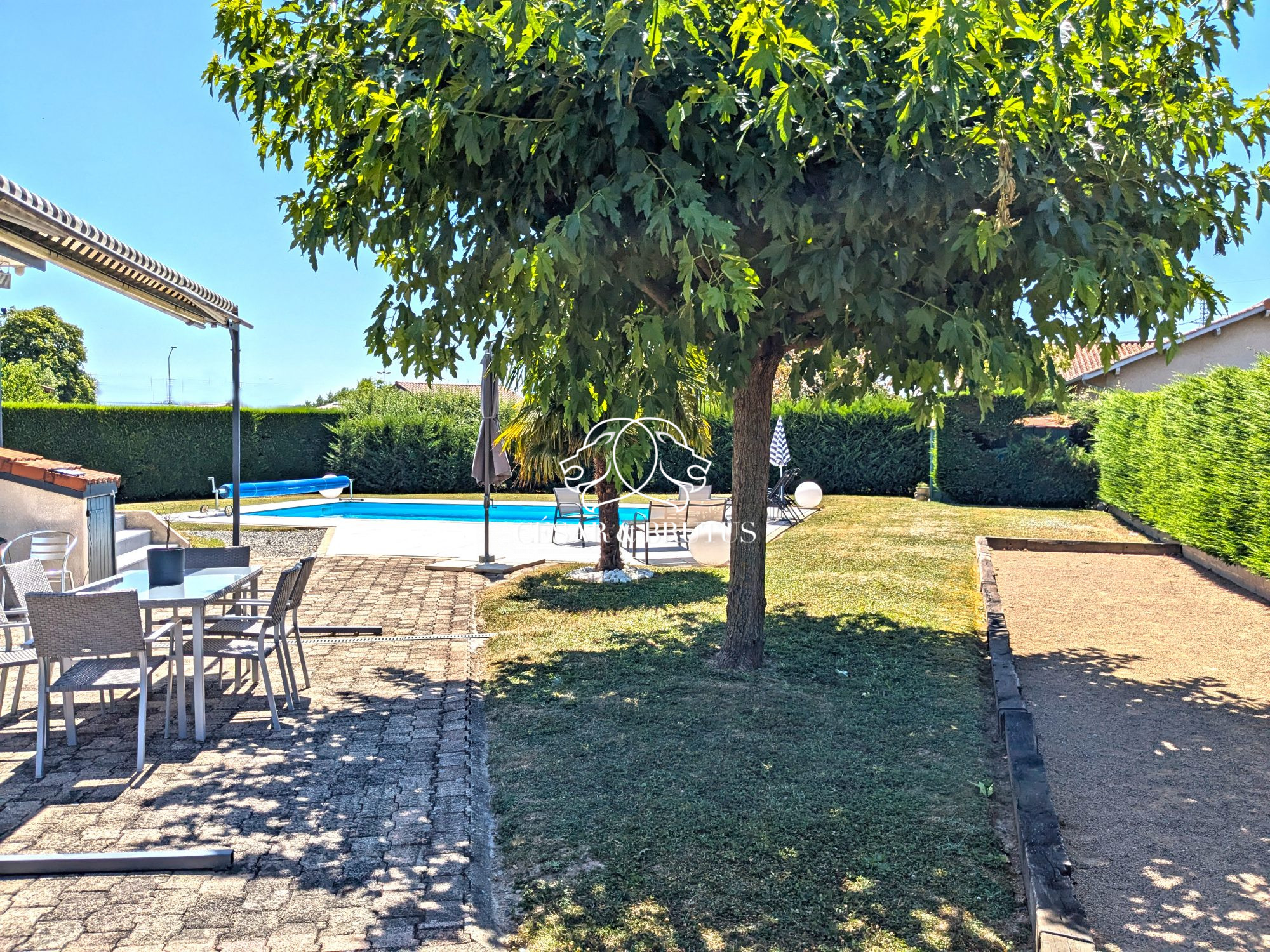 - Terrain plat et arboré de 1640 m² accessible par portail électrique. Terrasses en triple orientation Est, Sud et Ouest pour profiter pleinement des différentes saisons. Piscine 8x4 à fond plat, avec grande plage carrelée et terrain de pétanque pour des moments de détente et de convivialité. Les hautes haies végétales tout autour de la parcelle vous garantirons l’absence de vis-à-vis pour une intimité préservée.DPE C. Chaudière Gaz à condensation dernière génération.