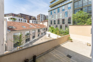 Ses atouts : son orientation Est-Ouest traversant, le parquet chevron massif, une belle hauteur sous plafond, les cheminées en marbre et les moulures d'origines, les carreaux ciment d'époque et la grande terrasse commune.
