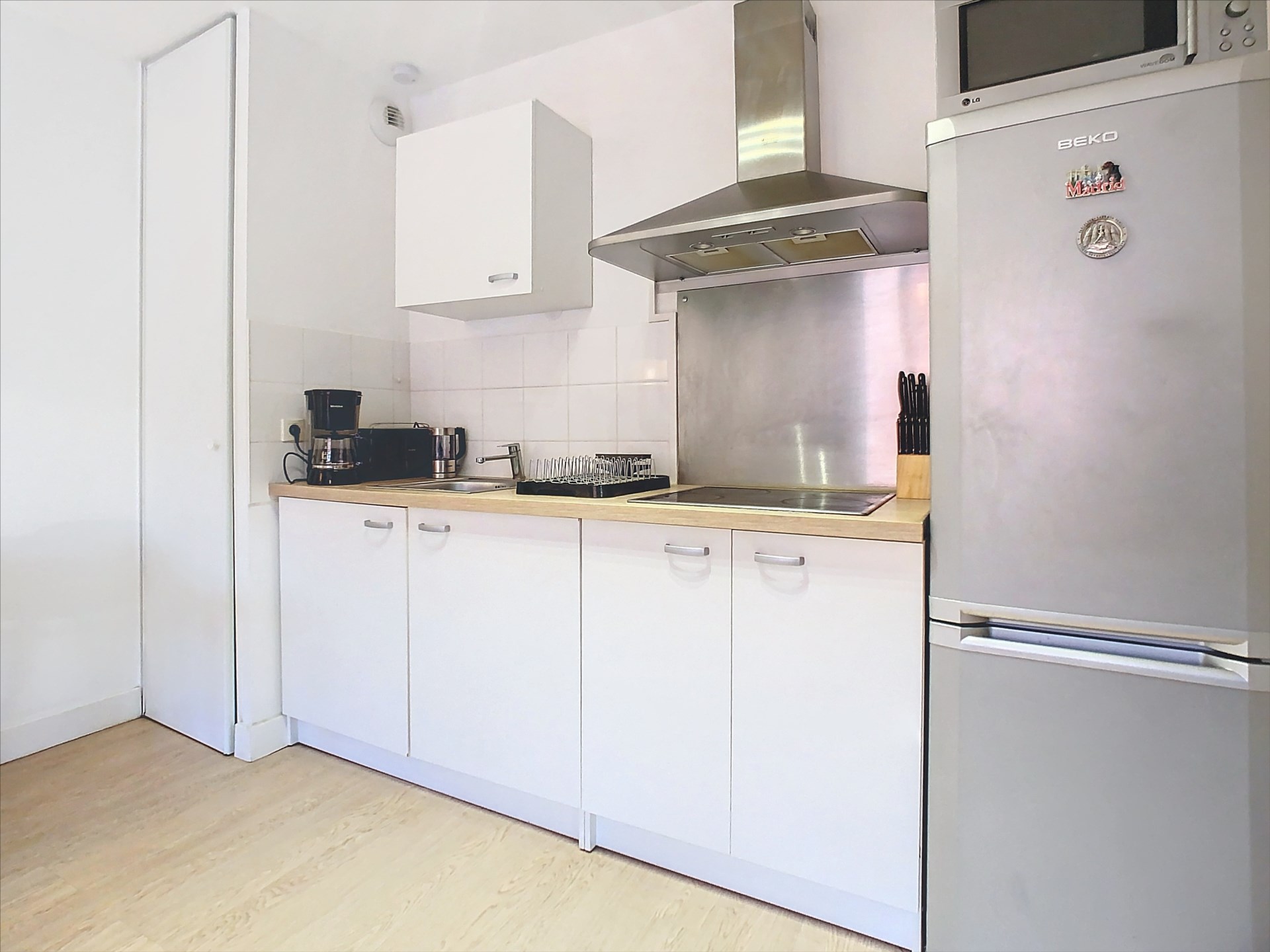 L'appartement se situe au 3ème étage et se compose d'une entrée avec placard mural, d'une pièce de vie lumineuse avec cuisine aménagée et équipée (réfrigérateur, plaques de cuisson, hotte, micro-ondes) ainsi que d'une salle d'eau avec WC.